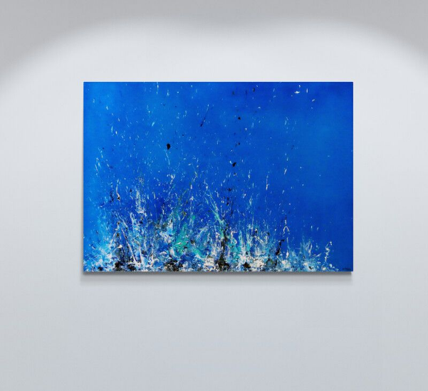 This original acrylic painting reflects the power and beauty of nature. Inspired by the waves in front of me and their chaotic journey onto the rocks, I captured the climatic crash that sends colours and patterns into the heavens above.